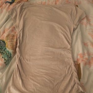 Grayish-tan t-shirt. V-neck. Ruched detail on sides. Thin material.
