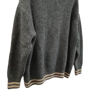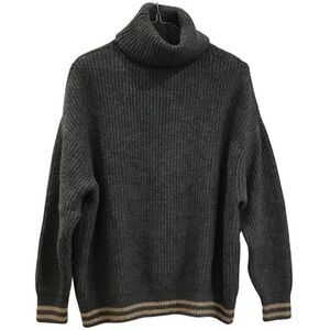 Beautiful soft and cozy, oversized pre-owned gray pullover turtleneck sweater with camel stripes around wrist and waistband. Has been professionally dry cleaned. Approximate measurements: Chest 50”, Length 26”. Acrylic 65%, Nylon 15%, Polyester 13%, Wool 4%, Elastane 3%.