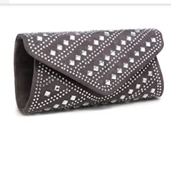 Love this girl! Gray velvet clutch with detachable shoulder strap LOADED with Studded Metal and Rhinestone Details! Magnetic Closure!