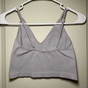 Stylish gray ribbed crop top with spaghetti straps. Perfect for casual wear.