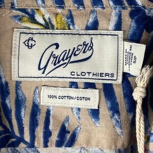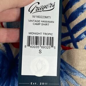 Keywords: Grayers, Hawaiian shirt, camp shirt, vintage, tropical, coconut, palm print, button down, short sleeve, men's shirt, beach shirt, vacation shirt, small, S, Midnight Tropic