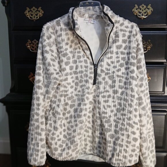 Gray & off-white faux fur pullover by Discount Divas Boutique - size large. Very soft fabric, faux fur polyester. 3/4 zip up front. Has nice soft lining. Like new, smoke-free home, no stains or marks.
