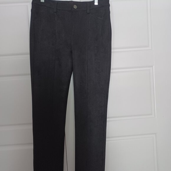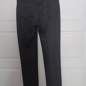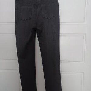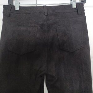 Black faux suede 5 pocket pant. 28" inseam. Never worn. Front zip. Belt loops. Good stretch in the fabric. 90% polyester 10% spandex.