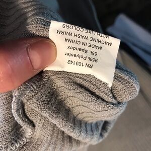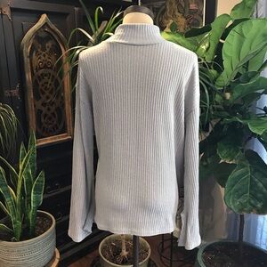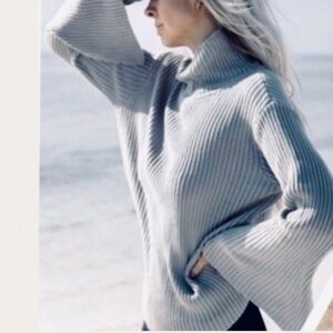 218. Grayson Ribbed mock neck bell sleeve gray top. Sizing tag not available, sample sale. Displayed on a size small dress stand. A light/medium gray. Boho chic, beach wear, bohemian retro vintage vibe