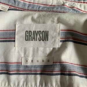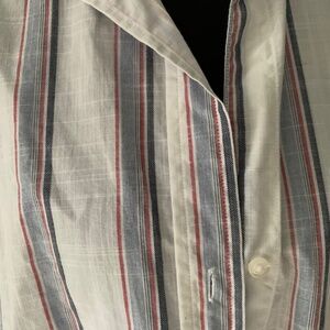 Super cute with jean shorts or alone over your bathing suit at the beach! Shirt from Grayson (RIP) in their size 1 which is probably like a size 4. Mostly white with red and blue stripes.