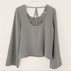 NWOT Grayson Threads Women’s Size XS Long Flared Sleeve Grey Blouse. W Strappy Back. In Brand New Condition.