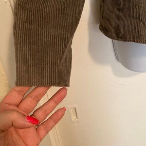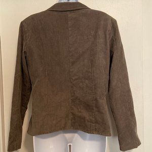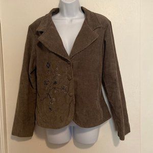 Euro size 44 (converts to a US size XL 12). Light brown/grey cotton corduroy blazer with padded shoulders. 3 large buttons and fold over lapels. Beaded floral design on front. GUC. No rips, stains or defects known.