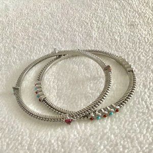 1 Set of 6 vintage RJ Graziano CN crystal and turquoise gemstone bangle bracelets. Bracelets measures approximately 7-3/4" inside diameter. 2-3/4” diameter across the opening. Perfect accent for any outfit. Very versatile and classy. Never worn. Excellent condition. All crystals and gems are intact.