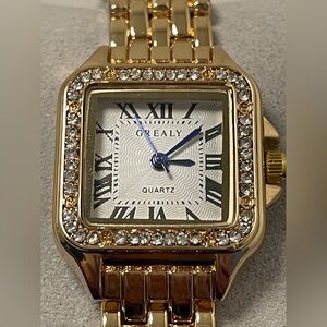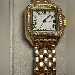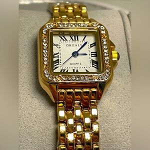 Elegant gold watch by Grealy. Features crystal accents and a classic design. Roman numeral dial with blue hands. Cartier vibes brand new battery works perfectly.