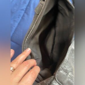 The purse has a silver hardware color and zipper accents that add a touch of sophistication to the design. The interior is lined with polymer and has a black lining color. The handle/strap material is also leather. This vintage medium-sized purse is handmade in the United States and is perfect for any occasion.