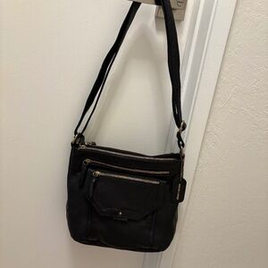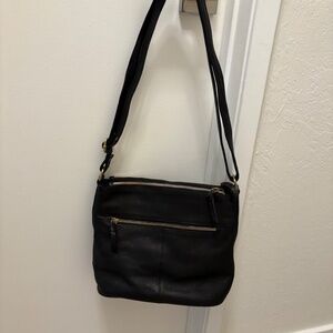 6 zippered compartments! Nice quality leather. Clean and no damage. Strap is fully adjustable. Beautiful bag!