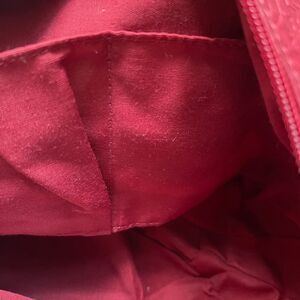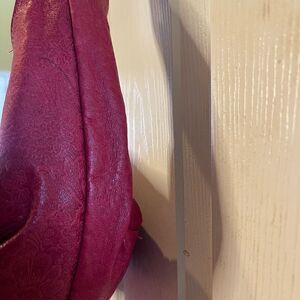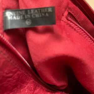 Great American Leather works Cherry red leather embossed knot shoulder bag.top zipper hidden side zipper the inside lining has a side zipper and two side pockets. Pre owned in good used condition no tear clean normal wear see all pictures any questions please message.
