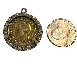 Great Britian Half Penny 1952 Pendant Gold Tone Crystal and Pearl Frame