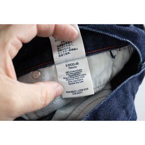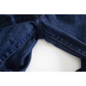 WASH: Dark blue wash with some whiskering. There is some color that has rubbed off or washed off unevenly at the inside of the ankles, but it's not super noticable when worn + does not impact functionality.