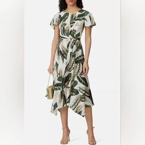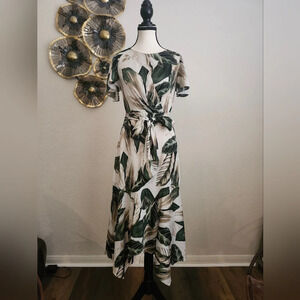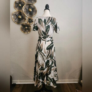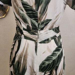 Great Jones Cream Green Tropical Leaf Print Tie Waist Midi Dress