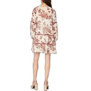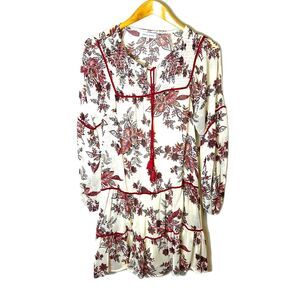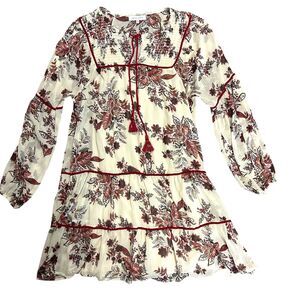 Great Jones Ivory Chiffon Burgundy Floral Smocked Tie Neck Tiered LS Mini Sz M