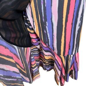 Great Jones Vibrant Orchid Wrap Dress Midi Layered Orange Purple Pink Black Size Medium. Excellent condition. High Low. See photos for details and measurements. Multi stripe woven (100% Polyester). Wrap. Sleeveless. V-neckline. Fluttery ruffles add flirty flounce to this of-the-moment Great Jones wrap dress printed in pretty stripes. Great for wedding, party, shower, Clemson, date night, cocktail, vacation, cruise, beach, summer, sundress, sexy