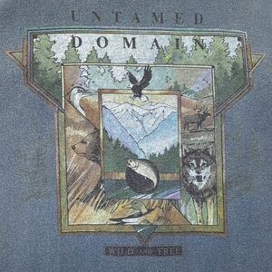 VTG and straight out of the 90s - This graphic tee was made in the USA to feature short sleeves, a ribbed crewneck, a single stitch hem, and a classic, relaxed fit. It is faded blue in color with a full color graphic on the front that says Untamed Domain - Wild and Free with illustrations of wild animals and nature scenes. It is soft, lightweight, and comfortable. Pair with jeans and sneakers for a casual, retro look! High quality!