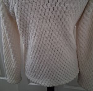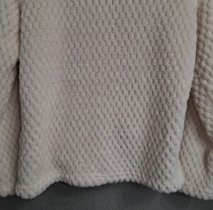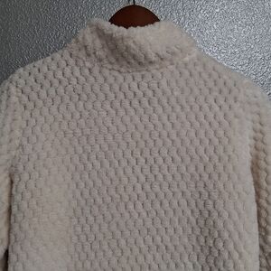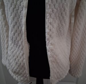 Stay cozy and stylish with this cream fleece jacket, lightweight, full zip closure, mock neck, pockets.
