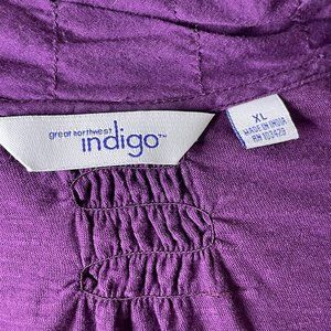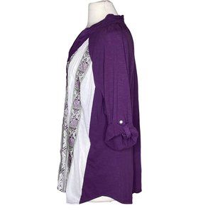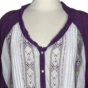 Great Northwest Indigo XL embroidered top in purple and cream. Roll tab sleeves.