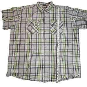 This Great Northwest shirt for men in size 2XLT features a green plaid pattern with a collared neckline and short sleeves. The button-up closure adds a classic touch to this preppy shirt, making it suitable for various occasions including travel, casual outings, workwear, and business meetings. The shirt is made of comfortable cotton knit fabric and can be machine washed for easy care. The shirt's vibrant colors and beachy theme make it a perfect addition to any wardrobe. Whether you're a fan of retro or nerd styles, this shirt is sure to impress. Made in Kenya, this shirt is a high-quality unit that will last for a long time. Has a 58-inch chest and is 32 inches long.