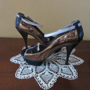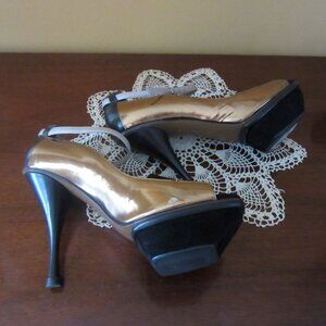 Great pair of high heel shoes in black and gold. Tan or light beige accents including the strap that goes around the ankle. The shoes are made by Marni. Open toe leather shoes made in Italy. The heels are super high measuring about 4 3/4" high. The platform in the front is about 1 1/4" high. The black and tan are a soft leather while the gold is more of patent leather.