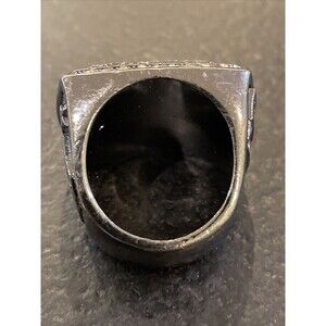 Gray, black metal, youth baseball, tournament runner-up championship ring for The Great Southern Sports Association (GSSA) in an adult size 11.5. Clear rhinestones embellishment and GSSA logo on top of the ring. An American flag and logo on the sides. In great pre-owned condition.