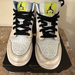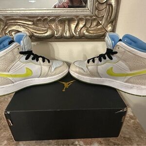 Excellent condition and rare color. Air Jordan 1 in platinum, blue, and volt. Only worn once. Size 5. Comes with original box, Jordan sticker and Nike shopping bag.