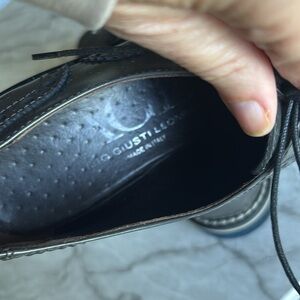 Patent leather brogues in grey with blue foam rubber sole. Worn a few times then sat in closet for a while. Never go out of style comfy and cool. Made in Italy
