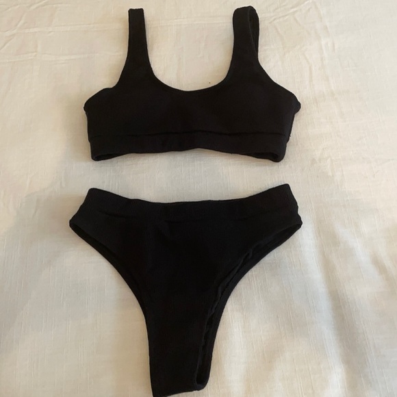 Supportive top with high waist, cheeky bottoms. Very comfy and cute!