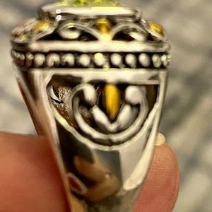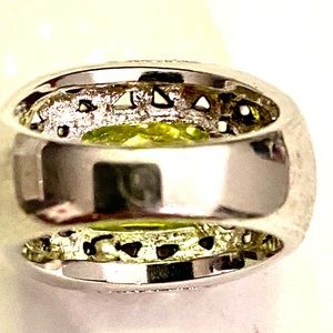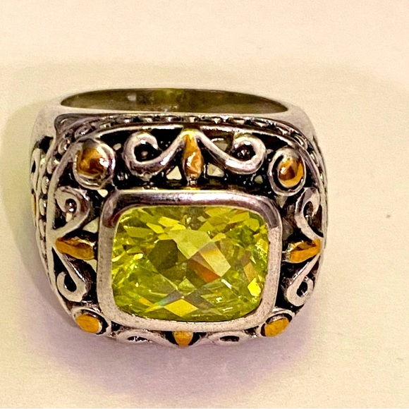 Great detailing. Has good and silver, so can be worn with either/both. Great green center stone. Looks very designer. Sturdy, but lightweight to wear. Approx size 8.
