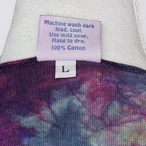 This dress features a colorful tie-dye pattern with decorative butterfly and swirl prints.