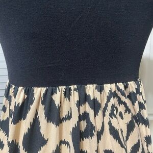 This elegant sheath maxi dress features a black short-sleeved top with flutter sleeves and a classic crew neck, complemented by a tan patterned skirt. Perfect for work or casual occasions, it combines style and comfort effortlessly.
