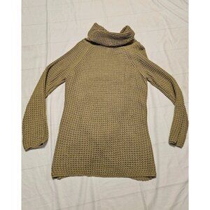 The Grecerelle Chunky Asymmetrical Knit Pullover Cowl Neck Sweater in size medium is a stylish and comfortable option for women looking for a bohemian vibe in their wardrobe. The sweater features a unique cowl neck design and long sleeves, making it perfect for cooler weather. The knit fabric in a tan color adds a cozy and trendy touch to the pullover, which is ideal for casual everyday wear or adding a stylish accent to a more dressed-up outfit. This sweater is a versatile piece that can be paired with different bottoms for a variety of chic looks. Measurements in photos.  New without tags