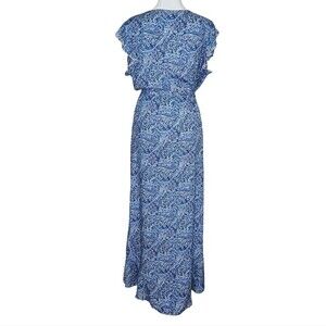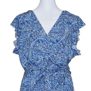 Grecerelle Hi Low Dress Faux Wrap Front Flutter Sleeve Blue Paisley Print XL