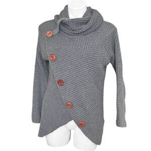 Cowl neck. Asymmetrical faux wrap front. Large decorative wooden buttons. 100% acrylic, machine or hand wash.