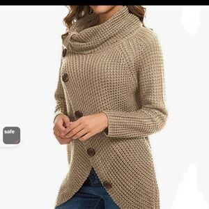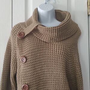 Neutral waffle weave acrylic sweater with cowl neck and button detail.