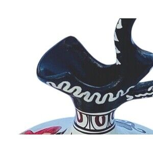 Greece Terra Cotta Hand Painted Ewer Vase features a unique nude man angel design with intricate hand-painted details. The medium-sized vase stands at 7.75 inches tall and is made of glazed terracotta, showcasing vibrant colors such as black, beige, red, and yellow. Handmade in Greece.
