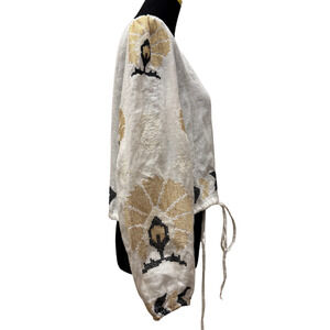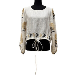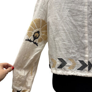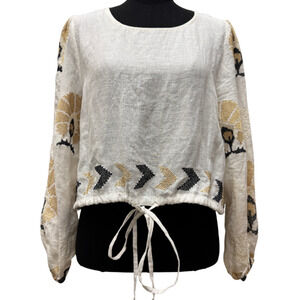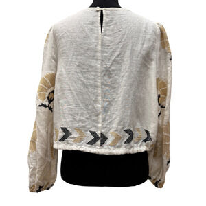 Greek Archaic Kori White Embroidered Linen Long Sleeve Crop Top Blouse Small