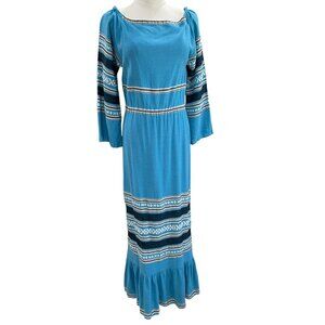 Step into effortless elegance with this vintage-inspired bohemian maxi dress by P. Kontizas, made in Greece. This stunning piece features an intricate ethnic-inspired woven pattern in black and white on a vivid turquoise blue background. The square neckline and slightly gathered shoulders create a flattering, feminine shape, while the smocked elastic waist gives definition without compromising comfort.