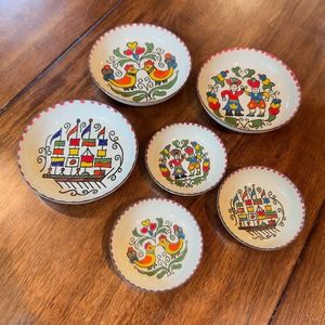 A set of six trinket dishes, coasters or wall displays. These pieces are made from enameled metal adorned with traditional, hand drawn Greek designs. The back reads: "Traditional Popular Designs Drawn By Hand. Greek Enamel Art. Moissiadis Greece."