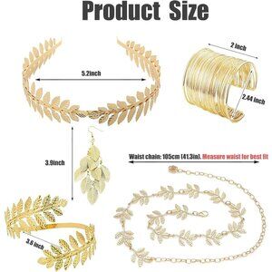 Features: An 8-piece collection that transforms your look with a handcrafted, classical Greek-inspired vibe. Includes a majestic gold leaf crown, a long waist chain, elegant armbands and bracelets, plus dangling earrings — all crafted with museum-quality gold leaf detailing on durable alloy. The pieces are lightweight for all-day comfort and can be gently bent to fit perfectly.