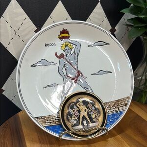 Celebrate rich Greek artistry with this exquisite pair of handmade decorative plates from Rhodes, Greece. One features the classic Dakas ceramic style, while the other showcases the iconic Colossus of Rhodes by Manousakis Keramik. Both are vibrant, collectible pieces perfect for wall display or elegant tabletop décor.