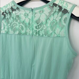 This charming green dress is perfect for special occasions, featuring a sleeveless design with a classic lack upper surrounding neck. The fitted bodice and flowy graceful A-line skirt, offers a timeless silhouette. Made from a light, flowing polyester fabric, it ensures comfort and elegance.
