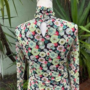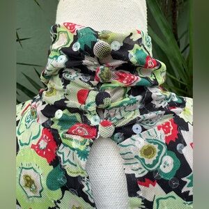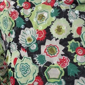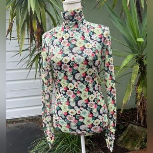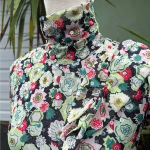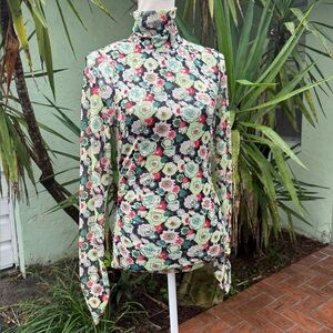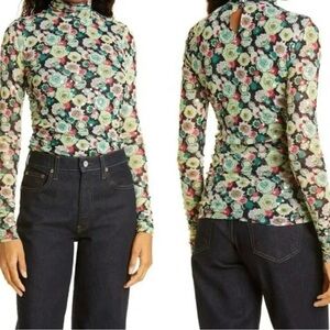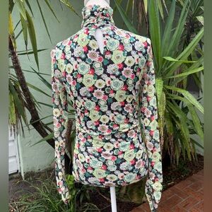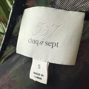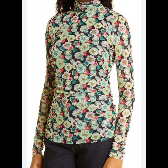 Cinq a Sept floral shirt with clear sequins that gives it a sequin sparkle in the light. I think this is a really cool top and we all love ruching. It’s creates style and hides imperfections. This also has a keyhole in back of neck with round button closure and a ruched turtleneck. Size small. New condition. No flaws. French phrase meaning 5 to 7. New York based fashion brand. From Revolve