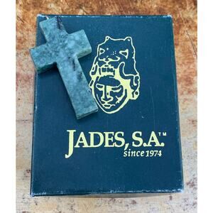 Green agate cross pendant in box, vintage. Cross measures 1.75 inches long by almost 1 inch wide. Comes in original box purchased in . No seen markings.