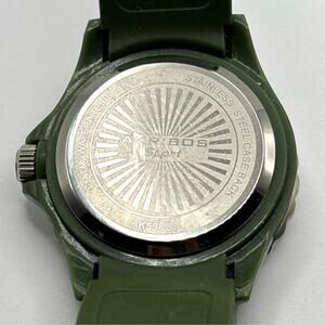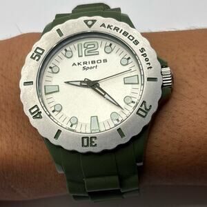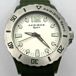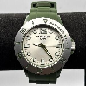 Green Akribos Men's Watch. Fully functional with brand new batteries. Adjustable band fits 7 in wrist or near.