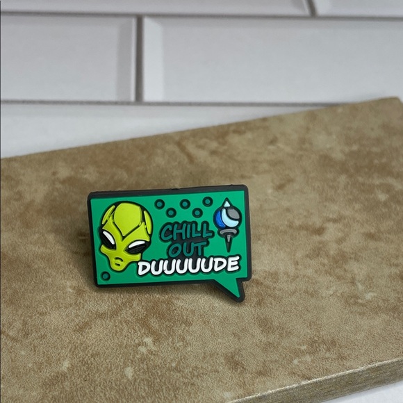 Fun green alien pin with 'Chill Out Duuuude' text. Perfect for adding a playful touch to your outfit.