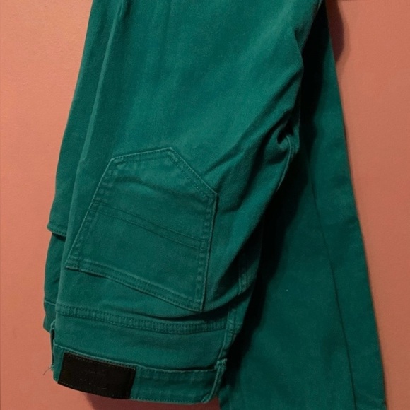 green denim, slim fit, cargo pockets, streetwear, casual, tapered, utility style, sporty, relaxed fit, retro