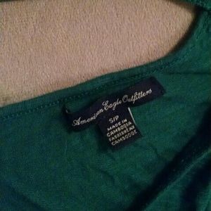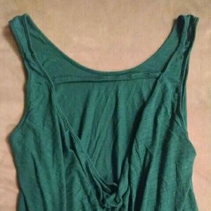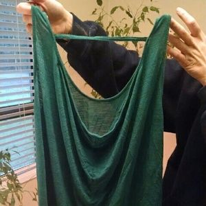 This is very soft and flowy. The back hangs and has the fabric bar across your shoulders. Very comfortable blouse. Never worn. It isn't green green...its a green blue shade. Hard to get the color.